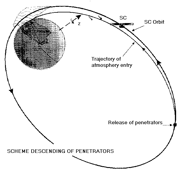 Dispersions of the orbital period can lead to a wide range of possible dates for Penetrator landings from 7 to 28 days after arrival because all orbital maneuvers must be visible from the ground tracking stations (Evpatoria and Ussurijsk). It is possible to jettison both Penetrators from the same revolution, or within a time interval of ~2 days. Each Penetrator will perform a braking maneuver 20-22 hours prior to atmosphere entry. The nominal entry angle is 9-13 deg. The orthodromic distance of the atmosphere path is 430 km with dispersion from 380 to 530 km. The atmospheric entry speed is 4.9 km/s. Dispersion of the Penetrator landings will not exceed ±4 deg along track and ±0.1 deg in cross. The following procedure will be used for deorbiting the Penetrators: