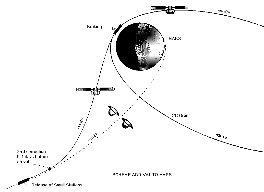 A small deflection maneuver will be performed after the release of the SS, about 4-5 days before arrival. The corrections will be based on range and range rate tracking of the spacecraft from Ussurijsk and Evpatoria plus VLBI measurements provided by the US DSN stations. Radar localization of the terrestrial planets is also scheduled during the flight for adjustment of the planetary ephemerides. The time of arrival at Mars is constrained by the desire to target the SS to pre-selected landing areas. Dispersion of the SS landings will not exceed ±550 km (in plane) and ±7 minutes in time. At the moment of SS release, the knowledge accuracy of the S/C position will be better than ±150 km in position and ±1 minutes in time. LANDING OF SMALL STATIONS AND ORBITER DEFLECTION MANEUVERIn the beginning of the chapterFive days before arrival to Mars, the two SS will be jettisoned and the Orbiter will be deflected to the trajectory needed for braking into the initial Mars orbit. Release of the SS is also possible at 4 days before arrival as backup. The deflection maneuver will be performed just after ejection of the SS and will be based upon the latest radiometric orbit determination data. The Delta-V for this maneuver will be less than 35 m/s.All SS candidate landing sites are situated in the Northern Mars hemisphere (ARCADIA Planitia) with landings occurring in daylight.
