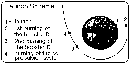 The deployment of the high and medium gain antennae are after fourth stage separation and before the initial S/C propulsion unit burn. The solar arrays and the platform PAIS with its science payload will be deployed after achieving the Mars transfer trajectory. The initial burn of the PROTON LV fourth stage provides a delta-V about 363 m/s. For injection to Mars from the parking orbit, it is necessary to add an additional delta-V of 3725 m/s: 3150 m/s from burn to completion of the fourth stage; and 575 m/s from the S/C propulsion unit. The control system of the S/C will autonomously adjust the attitude and delta-V parameters of the final injection maneuver as result of flight navigation calculations. EARTH-MARS TRANSFER ORBITIn the beginning of the chapterA type 2 interplanetary trajectory will be used having a heliocentric angular distance of travel greater than 180 deg for the MARS-96 S/C to reach Mars. The launch is scheduled on November 16, 1996, with arrival at Mars on 12 September 1997. Transfer time is about 10 months. Two midcourse corrections are scheduled during interplanetary cruise: the first correction will be 7-10 days after launch; the second will be one month before arrival to Mars. Total delta-V for these corrections will be less than 35 m/s.