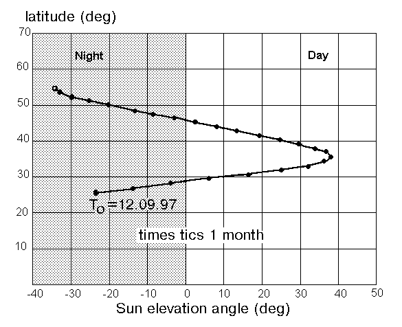 OPERATION FROM THE MARS ORBITIn the beginning of the chapter Most investigations from the Mars orbit will be concentrated near the pericenter of the orbit. Motion in this area is from North to South. Evolution of pericenter (latitude and zenith angle of the Sun ) is shown at the Figure.
