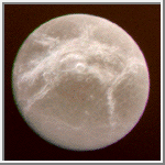 The origin of the bright whispy material is somewhat obscure. Apparently, it is material with a high albedo and is thin enough that it doesn't obscure the surface feature underneath. It might have formed from eruptions along cracks in Dione's surface that fell back to the surface as snow or ash.
