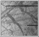 The Europa image received from the spacecraft earlier this week shows the cracked surface of this moon in greater detail than it has been seen before. The new image shows an area 150 miles by 140 miles that has been highly disrupted by fractures and ridges.